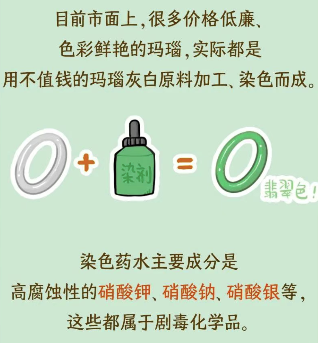低价染色玛瑙使用硝酸钾、硝酸银等高腐蚀剧毒化学品,重金属(铬、汞、砷)含量超标,长期佩戴蓄积致癌、破坏中枢神经、诱发基因突变,对健康危害无穷。